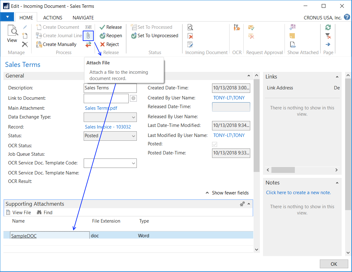 Click on the View Incoming Document from the Posted Sales Invoice's ACTIONS tab to view the associated, Incoming Document. Click on the paper-clip icon from the Process group, under the Home menu, to add a supporting attachment.