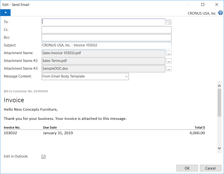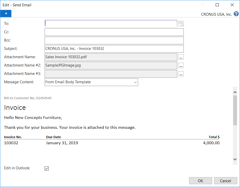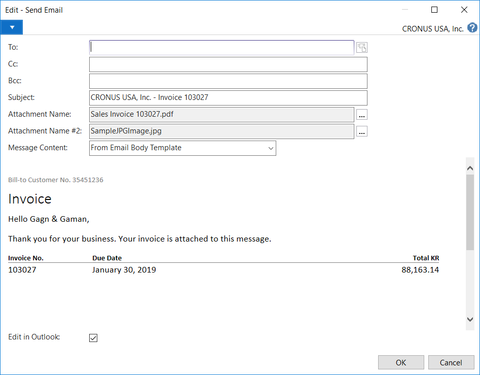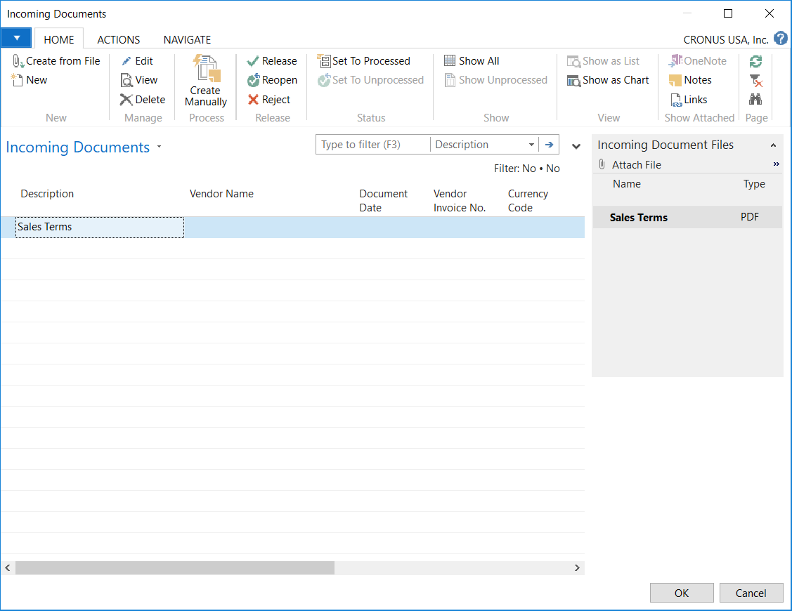 In order to create a sample email that has multiple attachments, we'll use NAV's built-in feature for including "Incoming Documents" as an additional attachment to the invoice itself when emailing. If the invoice already has an Incoming Document associated then we can skip to step 3.