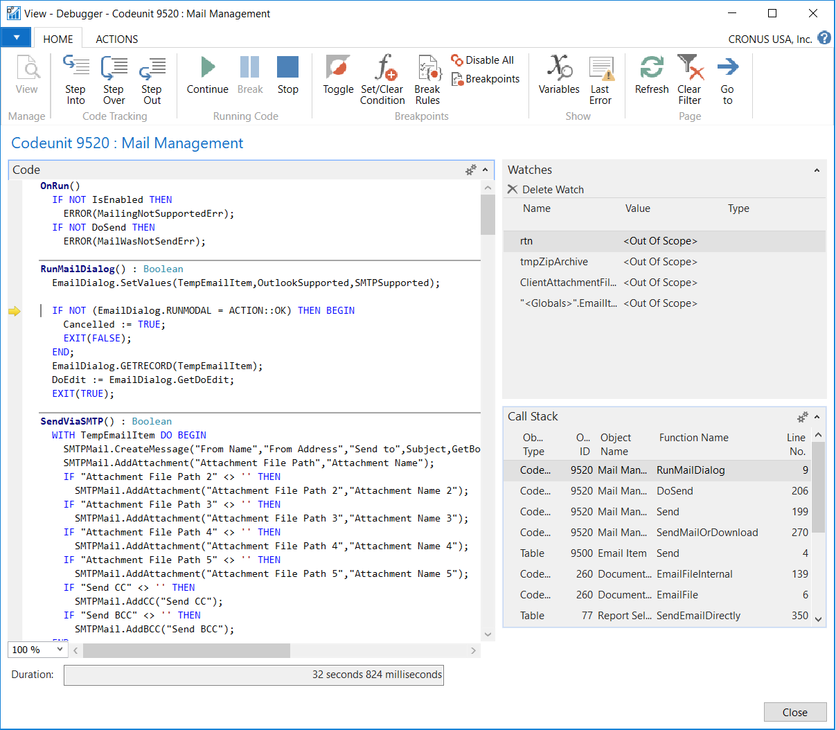 The SetValues function looked fine and the variables looked fine as well, so let's continue stepping through the code to try and figure out why it doesn't display properly. The OnOpenPage() function is the first step to show when stepping into the (EmailDialog.RUNMODAL...).