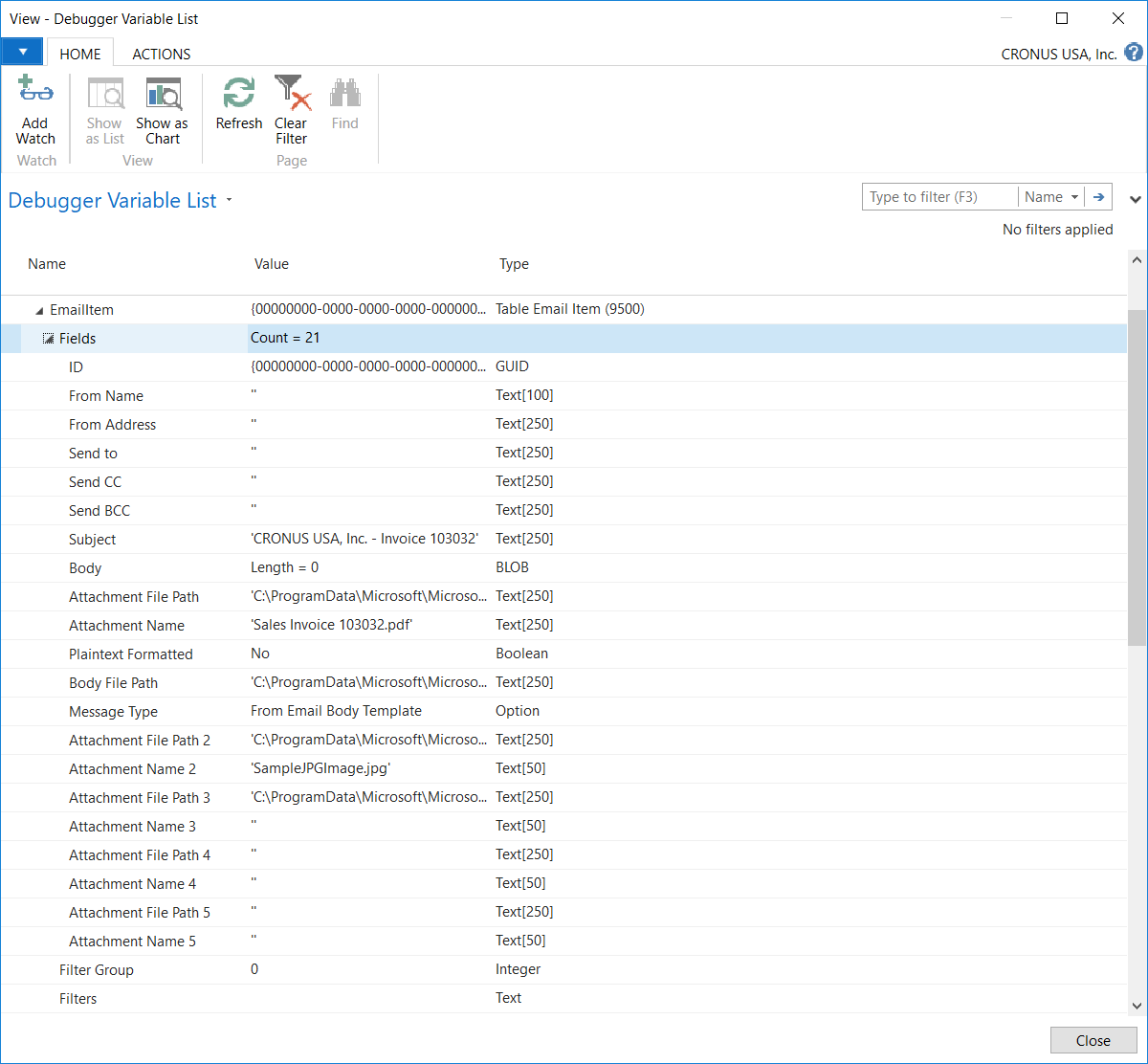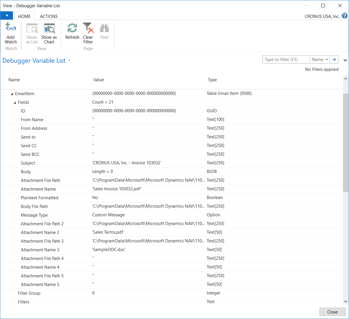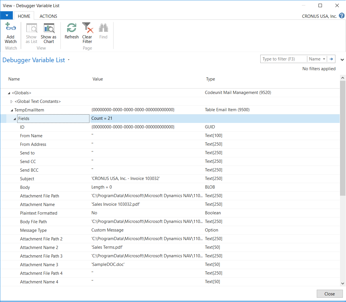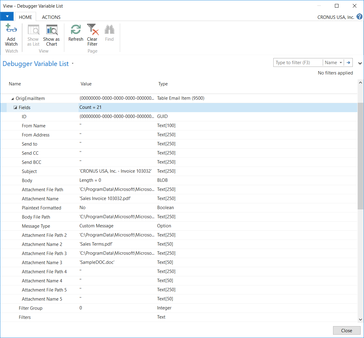Here, we can see that the TempEmailItem's values look correct, when it's being passed to the dialog. Attachment Name 2 is "Sales Terms.pdf" and Attachment Name 3 is "SampleDOC.doc".