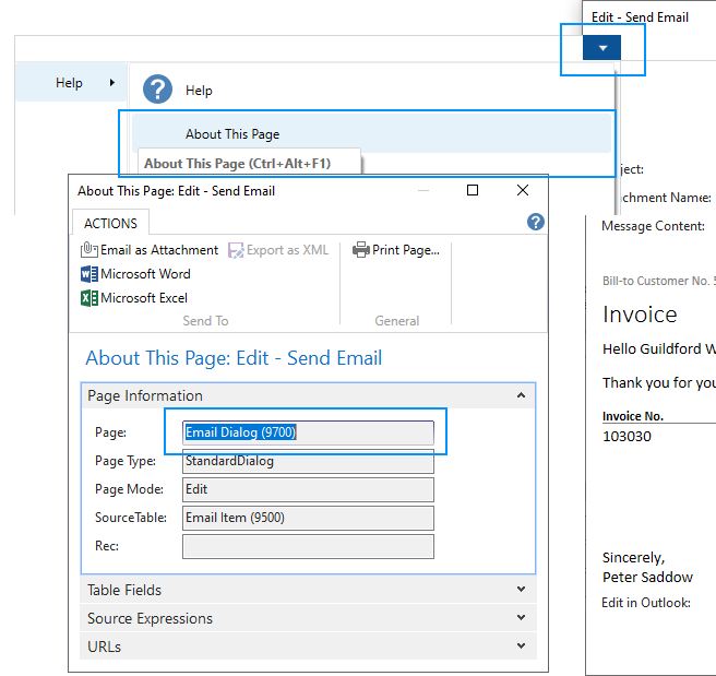 If you already know which page to look for, you can skip this step. Open the menu on the Send Email dialog and choose Help > About This Page. In the popup window, you should be able to tell exactly which Page number to look for in the Development Environment.